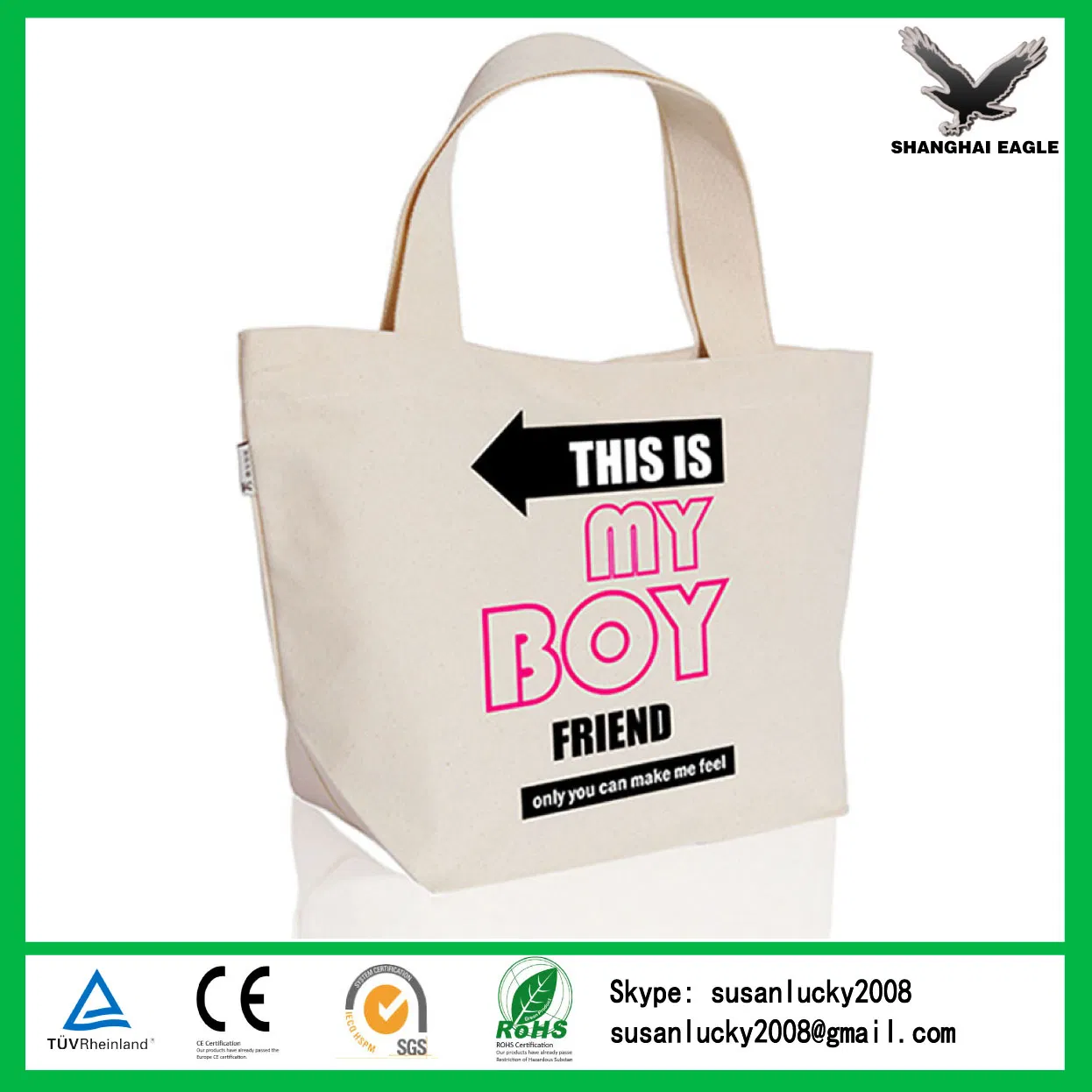 Recycle Cotton Canvas Tote Bag Customized:Shanghai Eagle Industry co.,ltd. Our factory is in Wenzhou of Zhejiang province. Our international department located in Shanghai of China. We has been producing shopping bags for many years, including insulated cooler bag, non-woven bag, PP woven bag, cotton/canvas bag, polyester/nylon bag, RPET/PET bag, foldable bag, drawstring bag, bag with zipper and so on. We can supply competitive price because this is the first handle price from our own workshop. We can supply and promise you high quality because we inspect quality from material booking, printing, lamination, cutting, stitching and packing step by step. We will reply your every inquiry by most speed service because we work same time as yours.Product description: Material: | 100% cotton | Industrial Use: | Gift/packing | Feature: | Recyclable |